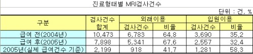 하지만 2005년의 MRI검사건수 7898건 중 실제 보험급여로 처방된 2199건을 기준으로 할 때 외래 41.7%, 입원 58.3%로 입원진료에서 더 많은 비중을 차지했다. 보험급여 후 1년동안 시행한 MRI검사 전체건수에 대한 급여 처방건수의 비율은 평균 27.8%, 외래는 17.2%, 입원은 50.1%로 외래진료에서보다 입원진료에서 급여처방이 32.9%만큼 더 많았다.