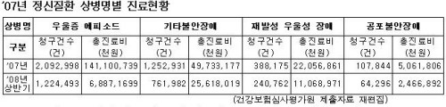 ’07년 정신질환으로 인한 진료비 청구건수는 874만8635건으로 ’04년 568만9784건에 비해 300만건 이상 증가했으며, 진료비는 9837억8208만1000원으로 무려 1조원에 달했다.