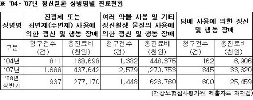 한편 수면제 등 사용에 의한 정신 및 행동장애는 ’04년 811건에서 ’07년 1688건으로, 약물 등 사용에 의한 정신 및 행동장애 역시 같은해 1382건에서 2579건으로 모두 3년새 두 배 가까이 증가했다.