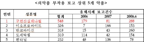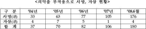 의약품 부작용으로 인한 사망․자살자 건 수가 ‘08.6월 현재 180건으로 5년 전에 비해 약 10배 증가한 것으로 나타났다.