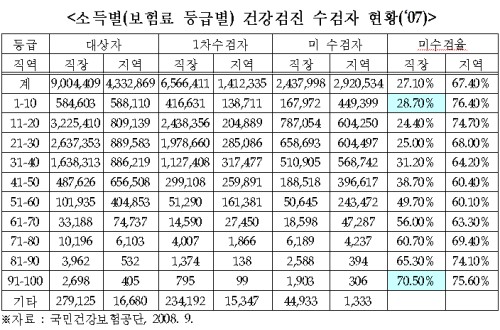 이 같은 사실은 국회 복지위 소속 한나라당 임두성 의원이 국민건강보험공단으로부터 제출받은 ‘소득별(보험료 등급별) 건강검진 수검자 현황(2007)’을 분석한 결과 드러났다.