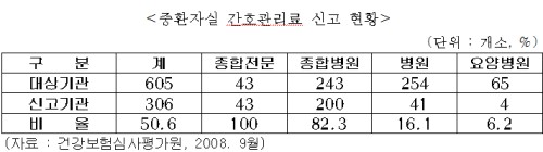 국회 복지위 소속 이애주 한나라당 의원이 최근 건강보험심사평가원으로부터 ‘중환자실 간호관리료 신고 현황’을 제출받아 분석한 결과, 2008년 9월말 현재 중환자실을 갖춘 605개 기관 중 50.6%인 306개 기관만이 신고한 것으로 나타났다.