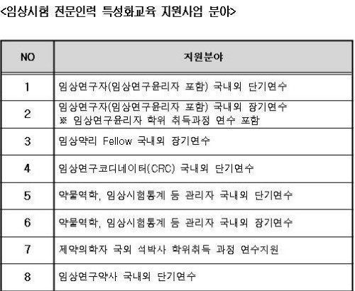 지원분야는 임상연구자, 임상시험통계 관리자, 제약의학자, 임상연구약사 등이며 선정된 연구자에게는 단기연수(1~5개월), 장기연수(6~12개월, 1년 연장 가능)로 나뉘어 연수비가 지원된다.