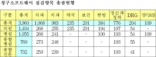 이에, 청구소프트웨어검사항목은 의원급 1404개, 병원급 1055개 항목, 종합병원 769개 항목, 종합전문병원 732개 항목이다.