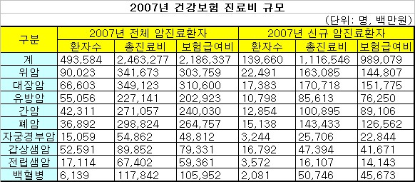국민건강보험공단은 5일, ‘2007년 건강보험 암환자진료 분석’을 발표했다. 공단이 발표한 자료에 다르면 `07년 암환자는 총 49만3584명으로 총 진료비 2조 4632억7700만원에서 보험급여비로 2조1863억3700만원이 지출된 것으로 분석됐다.