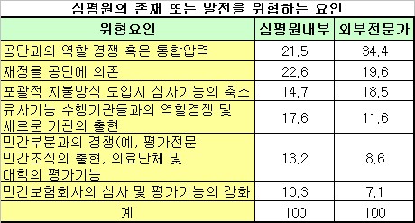 설문조사 결과에 따르면 심평원의 위협요인으로 ‘공단과의 역할 경쟁 혹은 통합압력’이라는 응답이 심평원내부 21.5%, 외부전문가 34.4%와 ‘재정을 공단에 의존’이 각각 22.6%, 19.6%로 공단을 최고의 위협요인으로 꼽았다.