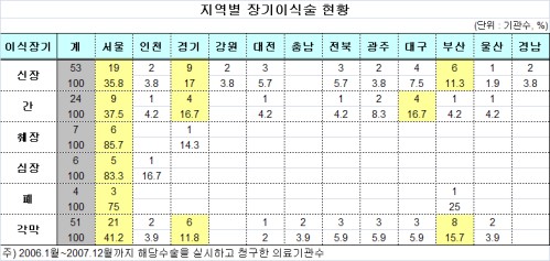 하지만 지역적으로 장기를 이식하지 않는 곳이 많은 것으로 나타났다. 심평원의 자료에 따르면 서울을 제외한 대부분의 지역에서는 신장, 간, 췌장, 심장, 폐, 각막 등을 하지 않는 경우가 흔했다.