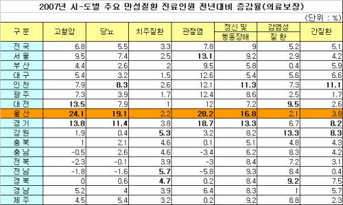 지역별로 만성질환 진료인원의 경우 지역적으로 울산이 가장 크게 증가한 것으로 분석됐다. 울산시의 증감률을 살펴보면 고혈압 24.1%, 당뇨 19.1%, 관절염 28.2%, 정신 및 행동장애 16.8% 등으로 대부분 두 자리 이상의 증감률을 보였다.