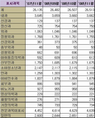 이는 08년 10월 2만6507개 기관보다 6개 기관이 늘어나는데 그쳤다. 그러나 표시과목별로는 전문과목미표시 전문의는 꾸준한 증가세를 보이고 있었다.