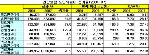 지난 1985년부터 지난 2007년까지의 노인의료비의 평균 증가율은 27.1%로 건강보험 전체연령의 진료비 평균증가율 18%보다 높아, 그 증가세가 매우 급격하게 나타나고 있었다. 65세 이상 노인의 의료비 증가율을 지난 2001년과 2007년을 비교했을 때에도 각각 3조1628억과 9조1190억원으로 증가율 188.3%를 보였다.