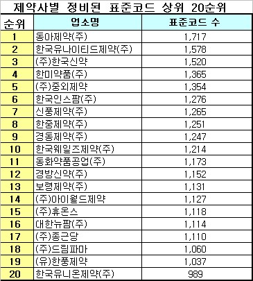제약회사별 정비된 포장단위별 제품 수는 동아제약(주)이 1717개로 가장 많았고, 한국유나이티드제약(주) 1578개, (주)한국신약 1520개, 한미약품(주) 1365개, (주)중외제약 1354개, 한국인스팜(주) 1276개 순으로 많은 제품이 정비되었고, 65개의 제약ㆍ수입사는 1~3개 제품이 정비됐다.