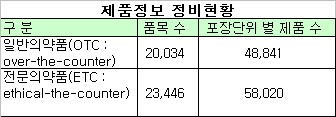 한편, 제품정보는 의약품의 품목별ㆍ포장단위별로 한글제품명, 영문제품명, 투여경로, 약품규격, 포장형태 등 17개 항목으로 구성됐다. 이를 의약품정보센터 포털(http://www.kpis.or.kr)을 통해 보고하면, 센터가 이를 확인ㆍ검토해 데이터를 관리한다.