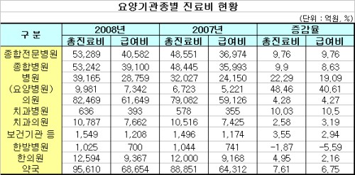 2008년도 요양기관 급여비가 전년대비 7.8% 증가했다. 종별 증가율은 신설된 요양병원이 높은 수요도를 나타내 40.6%로 가장 높았고 의원은 4.2%로 가장 낮았다.
