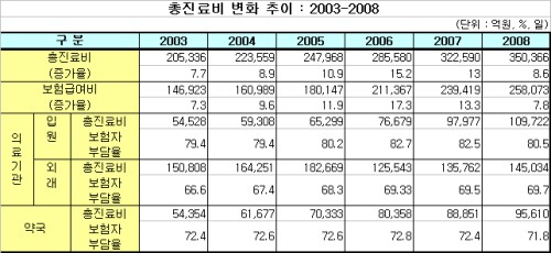 지난해 건강보험 총진료비 규모가 전년대비 8.6% 증가한 35조366억원이었으며, 요양기관 급여비 역시 전년도에 비해 7.8%증가한 것으로 나타났다.
