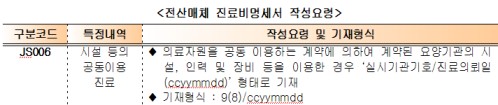 또한, 의료장비를 공동으로 이요하고 있는 기관의 경우에는 ‘요양기관 대표자의 확인이 돼 있는 공동이용계약서 사본’을 제출한 후 공동 이용해야한다. 만약 공동으로 장비를 이용할 경우에는 진료비명세서 작성은 다음과 같다.
