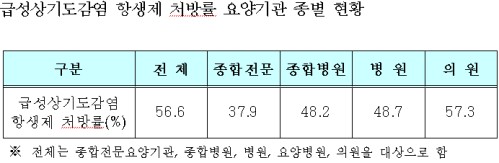항생제 처방률을 요양기관종별로 보았을 때 의원이 가장 높았다. 급성상기도감염 항생제 처방률의 요양기관전체 평균은 56.6%이다. 종합전문병원의 항생제 처방률은 37.9%, 종합병원 48.2%, 병원 48.7% 등으로 평가됐다.