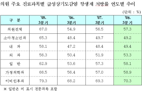 심평원이 발표한 평가결과를 살펴보면 의원전체의 급성상기도감염 항생제 처방률은 지난해 3분기 57.3%로 전년도 동기간 56.5%보다는 다소 낮아졌다. 그러나 여전히 처방률이 높다는 평가다. 이는 지난 2006년 3분기 54.9%에서 매년 높아지는 추세를 보이고 있다.