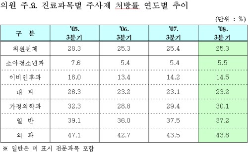 의원의 지난해 3분기 주사제 처방률은 25.3%로 지난 2005년 이후 지속적인 감소를 보이고 있다. 진료과목별 주사제 처방률을 살펴보면 외과의 처방률은 43.8%로 가장 높았다. 이어 일과과목의 경우는 37.2%, 가정의학과 30.1%, 내과 23.2%, 이비인후과 14.5%였으며, 소아청소년과의 주사제 처방률은 5.5%로 가장 낮았다.