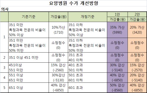 이건세 실장은 “현재보다 크게하는 방안은 의료법의 기준을 넘어서 인력 수준이 높은 병원에 대해서는 충분히 보상한다는 것”이라며 반면, “기준에 미치지 못하는 병원에 대해서는 강하게 감산해 자구노력을 해야만 한다는 위기의식을 갖도록 하는 것을 목적으로 한다”고 설명했다.