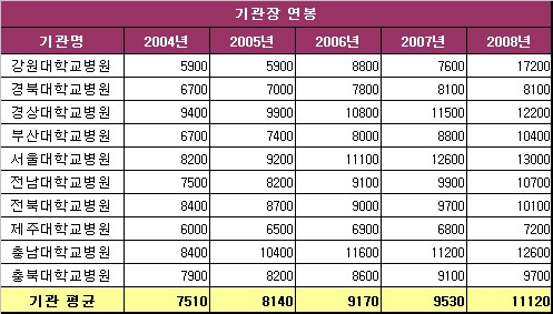 각 기관별 기관장의 연봉을 살펴본 결과 강원대학교병원장이 지난해 1억7200만원으로 가장 많은 보수를 받고 있었다. 특히 강원대병원 기관장의 경우 지난 2007년 연봉이 7600만원에서 지난해 1억7200만원을 기록해 증가폭이 상당하다.