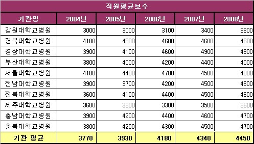 각 기관의 직원평균연봉은 대체적으로 비슷한 수준을 보이고 있었다. 10개 기관의 직원평균연봉은 2008년 4450만원으로 지난 2007년(4340만원)보다 2.5% 증가했다. 10여개 기관 중 직원평균연봉이 가장 높은 곳은 경상대학교병원으로 4900만원을 기록했다.