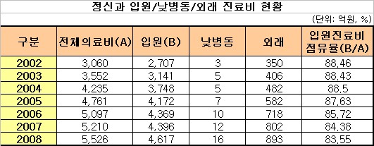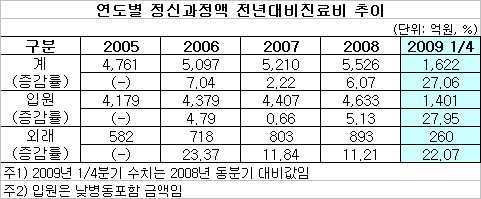 정신과 진료비는 지난 2005년 4761억원이던 것이 2006년 5097억, 2007년 5210억, 2008년 5526억원으로 매해 꾸준하게 증가하고 있었다.