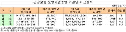 국민건강보험공단(이사장 정형근)은 최근 건강보험 요양기관종별 지급실적 현황(`09년 5월 누계)을 공개했다. 공개된 자료에 따르면 5월말 현재 총 진료비는 15조6049억3190만원으로 전년도 같은 기간 14조1724억5586만원보다 1조4324억7600만원(10.1%)이 증가했다. 또한 기관당 월 평균 3938만원을 지급받아 전년 동기 3648만원보다 290만원 늘어났다.
