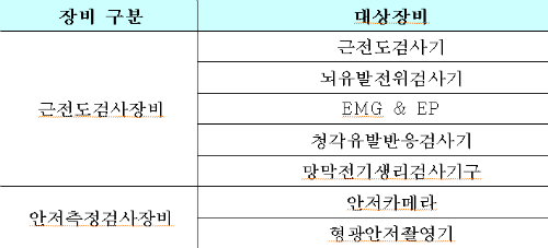 심평원에서는 우선적으로 근전도검사장비와 안저측정검사장비의 식약청 허가범위를 적용시키기 위해 요양기관에서 심평원에 신고한 장비현황 자료 중 모델명, 식약청 허가번호가 누락되거나 부정확한 요양기관에 대해서는 보완해줄 것을 요청했다.