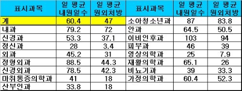 이어 안과가 하루 평균 64.5명, 재활의학과 65.1명, 가정의학과 60.4명 등으로 집계됐다.