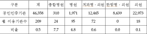 요양기관종별 이용현황에 따르면 종합병원 7.7%, 병원 4.8%, 의원 0.1%, 치과병ㆍ의원 0.6%, 한방병ㆍ의원 0% 등으로 자료제출을 위해 웹 사이트를 이용하지 않는다고 보아도 무방할 수준이었다.