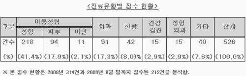 진료유형별로는 미용 목적의 성형수술이나 치과 진료가 대부분을 차지하고 있는 것으로 나타났다.