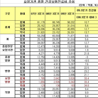 2009년 3분기 건강보험진료비가 전년도 같은 기간과 비교해 1조원 가량 증가한 이유에 대해 건강보험정책연구원 박문규 통계부장은 “노인인구 증가에 따른 노인의료비 급증과 요양병원 이용 증가”를 첫 번째로 꼽았다.