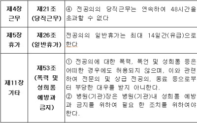 ‘전공의 표준 수련지침’은 전공의 연속 48시간 초과 당직을 금지하고 휴가에 대해서 14일 유급휴가를 명시하며, 폭력과 성희롱 등의 피해를 방지하기 위해 병원이 조치를 취해야 한다는 내용을 담고 있다.