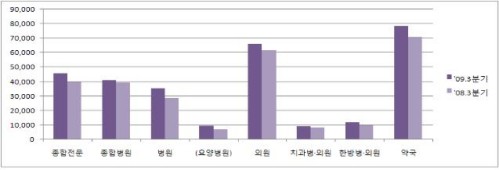 병원의 요양급여비용은 ‘08.3분기 2조8716억원에서 ’09.3분기 3조5328억원(23.0% 증가)으로 늘어났으며, 요양병원은 ‘08.3분기 7226억원→ ’09.3분기 9625억원(33.2% 증가)이 증가했다.