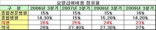 건강보험심사평가원(원장 송재성)이 발간한 건강보험 통계지표(2006년3분기~2009년 3분기)를 바탕으로 건강보험 요양급여비용 중 의원급 의료기관의 점유율을 분석한 결과, 의원급 의료기관의 경우 총 진료비에서 차지하는 점유율이 매해 1%씩 감소하고 있는 것으로 나타났다.