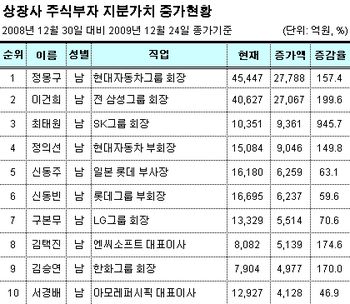 또 증시사상 첫 1조원대 주식부호에 올랐던 김택진 엔씨소프트 대표이사는 지난해말보다 5139억원으로 증가했고 김승연 한화그룹 회장은 4977억원, 서경배 아모레퍼시픽 대표이사도 4128억원이 증가했다.