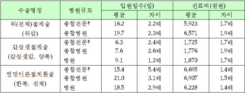 위(전체)절제술의 경우 입원일수 2.2배(종합전문)~2.3배(종합병원), 진료비 1.7배(종합전문)~1.9배(종합병원)였으며, 갑상샘절제술은 입원일수 1.2배(병원)~2.6배(종합병원), 진료비 1.7배(병원)~1.9배(종합병원)였다.