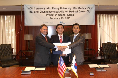 이어 정우택 지사는 23일, 미국 사학의 명문인 에모리대학교 의료원(Robert W. Woodruff 헬스 사이언스 센터)의 프레드 산 필리포(Fred Sanfilippo) 의료원장 겸 에모리대학교 수석부총장과 주) 바이오메디컬시티의 우종식 사장과 함께 오송 메디컬그린 시티에 에모리대학교의 암 전문병원인 Winship Cancer Institute를 유치하는 양해각서를 체결했다.