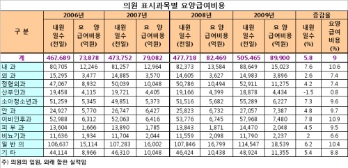 한편, 2009년 요양기관종별 심사실적에 따르면 가장 높은 증가율을 나타낸 것은 요양병원으로 전년도 대비 32.8%(08년 9981억원→09년 1조3257억원)나 급증했다. 병원 역시 전년도 대비 23% 증가했다.