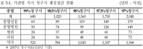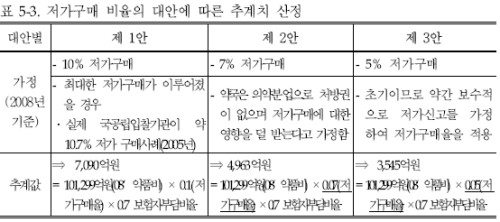 한편, 시장형 실거래가상환제도에 따른 추계 영향분석에 의하면 전체 요양기관을 대상으로 저가구매 10%를 적용할 경우 인센티브 금액 추계치는 7090억원(제1안), 약국은 요양기관보다 영향을 덜 받을 것을 가정해 7%를 적용해 추계할 경우 4963억원(제2안), 가장 보수적으로 5%를 적용할 경우 3545억원(제3안)으로 나타났다.