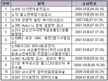 자가면역표적검사 등 11개 항목에 대한 재평가를 실시하기 위한 현황을 파악한다.