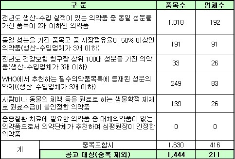 공고된 주요내용에 따르면 전년도 생산ㆍ수입실적이 있는 의약품 중 동일 성분을 가진 품목이 2개 이하인 의약품(192업체 1018품목), 동일 성분을 가진 품목군 중 시장점유율(연간 생산ㆍ수입실적 기준)이 50% 이상인 의약품(해당 품목을 생산ㆍ수입하는 업체가 3개 이하인 경우)(91업체 191품목) 등이다.
