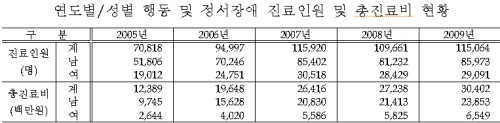 진료인원은 2005년 7만명에서 2009년 11만5천명으로 약 4만5천명 증가, 연평균 약 1만1천명씩 늘어날고 있었다. 총진료비는 2005년 124억원에서 2009년 304억원으로 약 180억원 증가해, 연평균 약 45억원씩 상승했다.