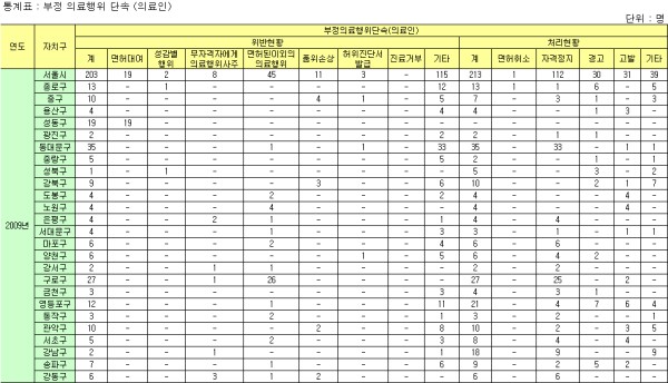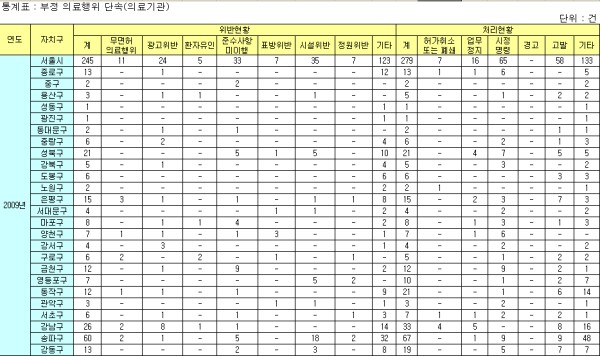 서울특별시가 최근 ‘2009년도 부정 의료행위 단속(의료인, 의료기관)’ 결과를 공개했다. 이번에 공개된 자료는 서울시의 각 구별로 의료인과 의료기관의 부정 의료행위를 단속한 결과이다.