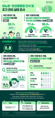 한국베링거인겔하임(사장 안나마리아 보이)이 당뇨병과 만성콩팥병의 상호 연관성 및 조기 관리 필요성에 대한 국민 인식 현황을 파악하기 위해 실시한 ‘당뇨병-만성콩팥병 인식 및 조기 관리 실태 조사‘ 인포그래픽을 8일 발표했다. 이번 조사는 한국베링거인겔하임이 진행하는 ‘당장(糖-腸) 캠페인’의 일환으로, 최근 심장-신장-대사질환(Cardio-Renal-Metabolic, CRM) 간의 연관성이 강조되고 있는 가운데, 만성콩팥병 연관 질환 및 조기 검사 필요성에 대한 국민들의 이해도를 확인하고자 시행됐다. 조사는 오픈서베이를 통해 전국 만 20~69세 일반 성인 1,000명을 대상으로 지난 11월 1주간 진행됐다. 조사 결과, 국민 3명 중 1명(33.7%)은 만성콩팥병에 대해 잘 모른다고 응답했다. 국민 10명 중 8명은 당뇨병(77.4%)과 고혈압(85.3%)이 각각 만성콩팥병의 주요 원인 질환임을 인지하지 못하고 있었다. 특히 만성콩팥병 환자의 절반이 당뇨병으로 인해 발생함에도 불구하고, 당뇨병 환자 중에서도 절반 이상(51.4%)이 해당 사실을 모르고 있는 것으로 나타나 인식 개선의 시급성이 드러났다. 만성콩팥병은 콩팥 기능이 3개월 이상 지속적으로 감소