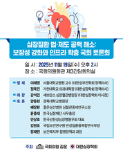 대한심장학회(이사장 강석민 세브란스 심장혈관병원장)는 11월 19일(수) 오후 2시 국회의원회관 제3간담회실에서 더불어민주당 김윤 의원과 함께 ‘심장질환 법·제도 공백 해소: 보장성 강화와 인프라 확충’ 국회 토론회를 공동주최한다. 이번 토론회는 현행 ‘심뇌혈관질환의 예방 및 관리에 관한 법률’이 심장질환의 특수성과 위험도를 충분히 반영하지 못하고 있다는 문제의식에서 출발했다. 심부전, 부정맥, 판막질환, 폐고혈압 등 중증·난치성 심장질환은 장기적 관리와 다학제 협력이 필수적임에도, 급성기 중심의 현 제도에서는 실질적인 보장과 인프라 지원이 부족한 실정이다. 이에 따라 이번 토론회에서는 환자 중심의 치료체계 구축과 보장성 강화, 심장중환자실(CICU) 확충 등 실질적인 개선 방안을 논의할 예정이다. 이날 토론회는 대한심장학회 이사장을 맡고있는 강석민 세브란스 심장혈관병원장이 좌장을 맡고, 이해영 서울대학교병원 교수(대한심부전학회 정책이사)와 정욱진 가천대학교 의과대학장(대한심장학회 정책이사)이 각각 ‘심뇌혈관질환법 개정의 필요성과 방향’을 주제로 발제한다. 이어 양동헌 경북대학교병원장, 배장환 좋은삼성병원 심혈관중재연구소장, 윤종태 한국심장재단 사무총장, 안