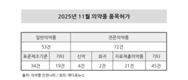 2025년 11월 식품의약품안전처의 주요 의약품 허가 건수를 분석한 결과 과반 이상이 전문의약품 허가로 나타났다. 식품의약품안전처 의약품 안전나라에 따르면 11월 의약품 품목허가 건수는 125건으로 이 중 전문의약품은 57.6%인 72건으로 확인됐다. 특히 희귀의약품 허가도 2건 있었다. 메디슨파마코리아의 제1형 원발성 고옥살산뇨증 치료제 ‘옥스루모(성분명 루마시란)’가 대표적인 희귀의약품이다. 제1형 원발선 고옥살산뇨증은 AGXT 돌연변이로 알라닌-글리옥실산 아미노전이효소가 결핍돼 간에서 옥살산염이 과다 생성되고 신장과 전신에 축적되는 희귀질환으로 요결석증, 신부전, 뼈 통증, 피부 궤양, 심근병증 등의 증상이 나타난다. 성인뿐만 아니라 소아 환자에도 사용할 수 있는 옥스루모는 간에서 글리콜산 산화효소의 생성을 억제해 체내 옥살산염 수치를 감소시키는 기전을 갖고 있다. 특히 식약처의 GIFT 제도를 통해 35호 제품으로 신속히 도입됐다는 점에서 의미가 있다. 11월 허가된 고혈압 치료제들 중에는 대표적으로 경동제약의 ‘발디핀플러스’가 있다. 발디핀플러스는 ARB 계열인 발사르탄과 CCB 계열인 암로디핀, 이뇨제인 클로르탈리돈의 성분이 결합된 제품이다. 고혈