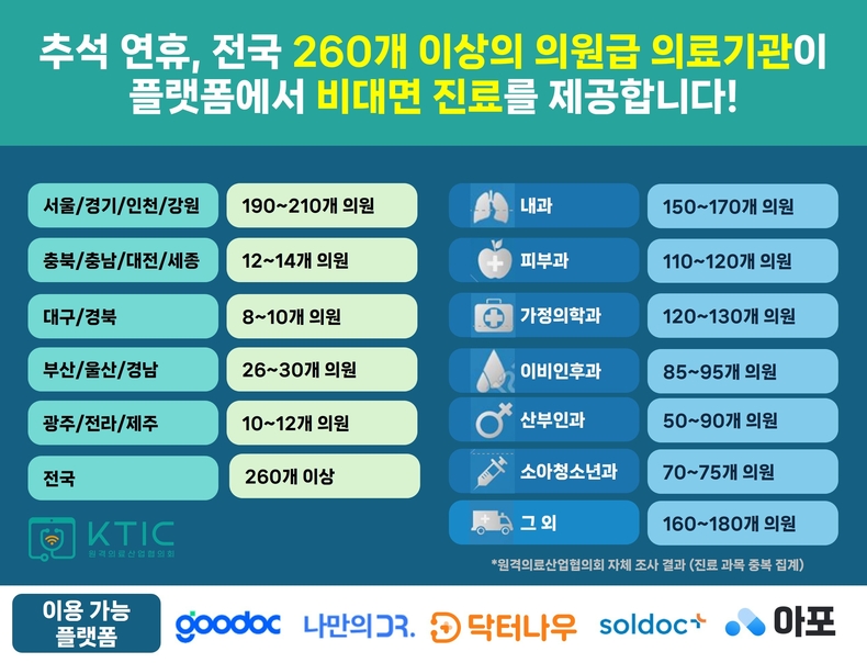 (사)코리아스타트업포럼 산하 원격의료산업협의회(이하 원산협)는 추석 연휴 기간 동안 회원사 비대면진료 플랫폼을 통해 전국 260개 이상의 의원급 의료기관이 비대면진료 서비스를 제공한다고 2일 밝혔다.
