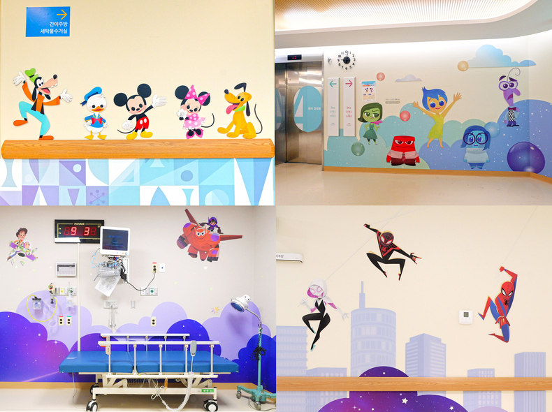 먼저, 7층 소아병동 입구에는 ‘기쁨이’, ‘슬픔이’, ‘버럭이’, ‘소심이’, ‘까칠이’ 등 <인사이드 아웃>의 주요 캐릭터 아트워크가 설치됐다. 서(西) 병동은 복도와 관찰실 벽면에 ‘미키와 친구들’을 비롯해, <토이 스토리>와 <몬스터 주식회사>에 등장한 캐릭터들의 아트워크로 밝은 분위기를 연출했다. 동(東) 병동은 <월-E>, <릴로&스티치>, <빅 히어로>, <스파이더맨: 뉴 유니버스> 속 캐릭터의 아트워크가 설치되어, 아이들이 보다 편안하고 안정된 분위기 속에서 치료를 받을 수 있도록 꾸며졌다. 또한 휴게실 창문에는 디즈니의 인기 캐릭터 '곰돌이 푸'와 그 친구들인 '피글렛', '이요르', '티거', <주토피아>의 주인공 ‘닉’과 ‘주디’, <밤비>에 등장하는 캐릭터 아트워크가 부착되어 산뜻한 활기를 더했으며, TV를 함께 설치해 환아와 가족들이 디즈니 콘텐츠를 시청하며 심리적 안정을 얻고 상상을 펼칠 수 있는 공간으로 마련했다.