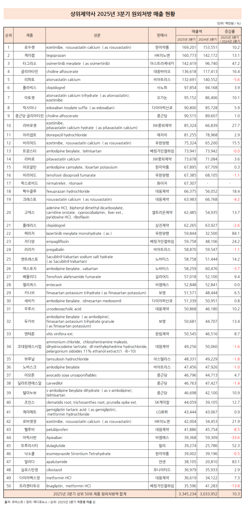 의약품 시장조사기관 유비스트에 따르면, 상위 50위 이내에 속하는 주요 의약품들은 2024년 3분기 3조 339억원에서 2025년 3분기 3조 3452억원으로 원외처방 규모가 10.3% 확대됐다.